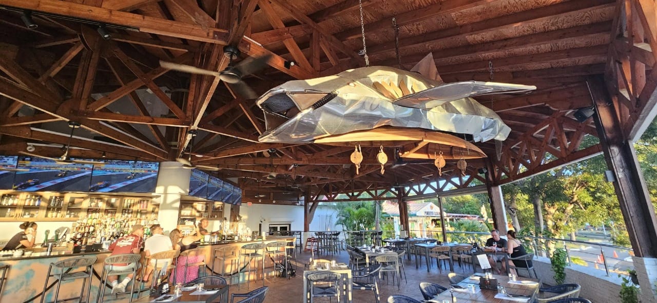 The terrace overlooks the lagoon, where sunset colors reflect off the water and the masts of the marina create a striking backdrop. Big screens around the bar keep the energy high on game nights, making it a natural gathering place for sports fans who want a lively setting with their drinks and dinner.