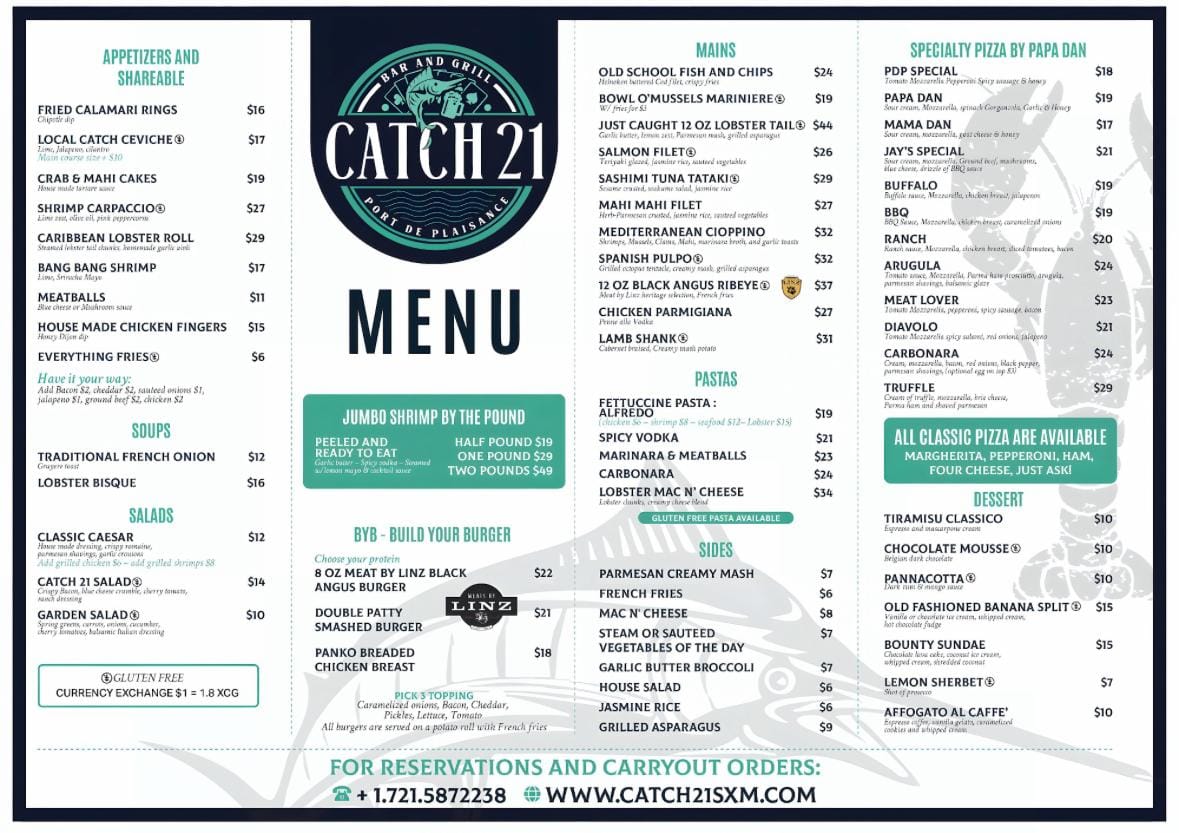 | 💻 | Online reservations at catch21sxm.com |