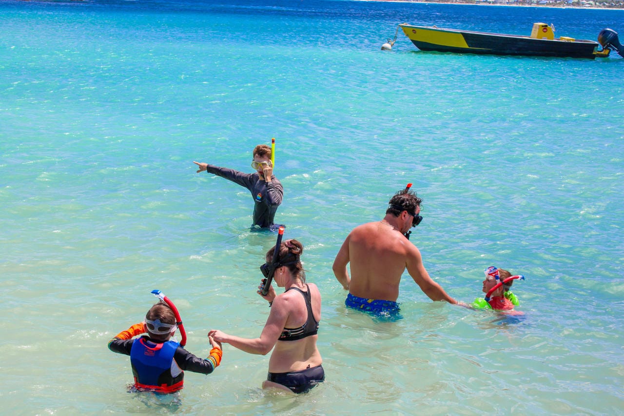 The island sits just offshore from Cul de Sac, a short five-minute crossing from the ferry dock where public parking is available. From the moment the boat touches the sand, the pace of the day changes.