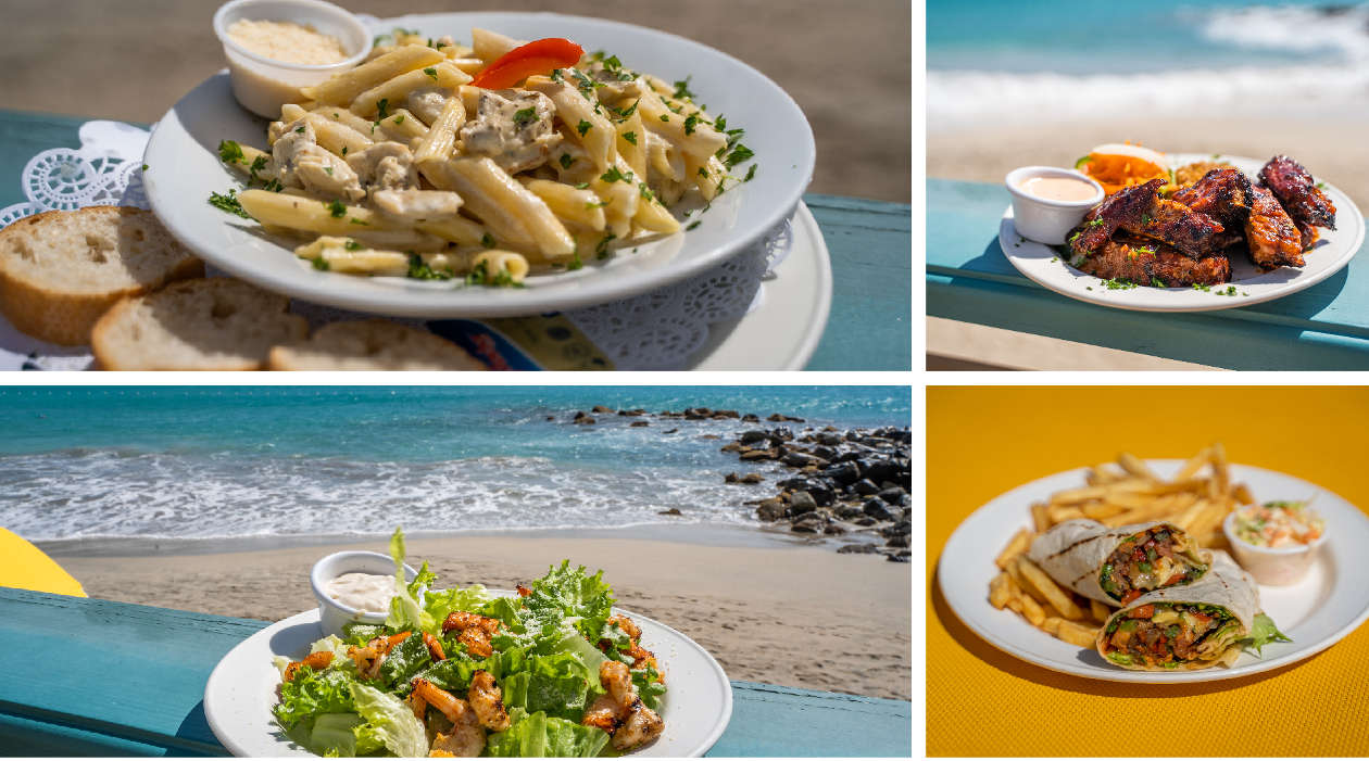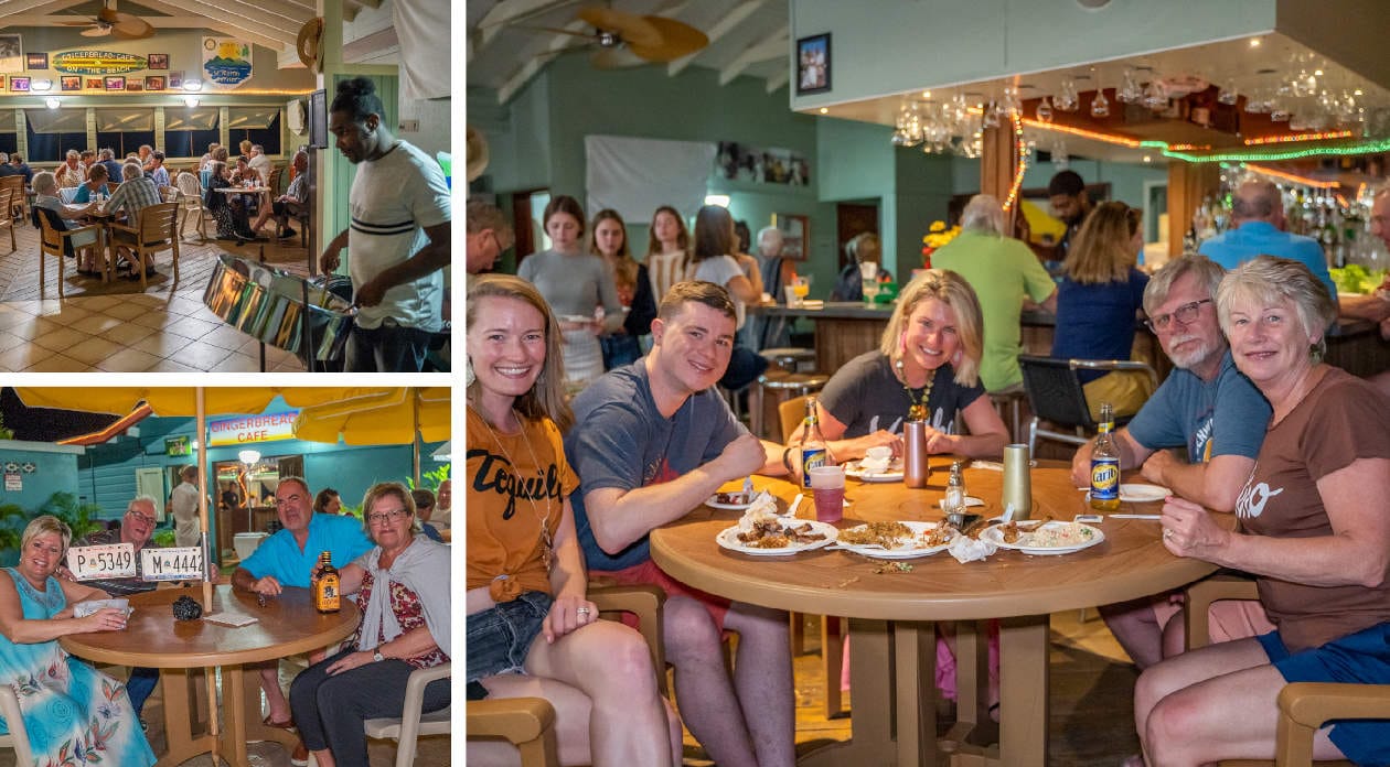 The Gingerbread Cafe sits directly on the beach at Belair, open seven days a week from 8am to 10pm for breakfast, lunch and dinner. The menu covers Caribbean and American cuisine, and the kitchen runs weekly specials that have become fixtures for returning guests — Monday night BBQ and Friday night Surf & Turf among them. The location makes it as much a place to linger as to eat: coffee in the morning with the sea in front of you, a cold drink at sunset with the cruise ships on the horizon.